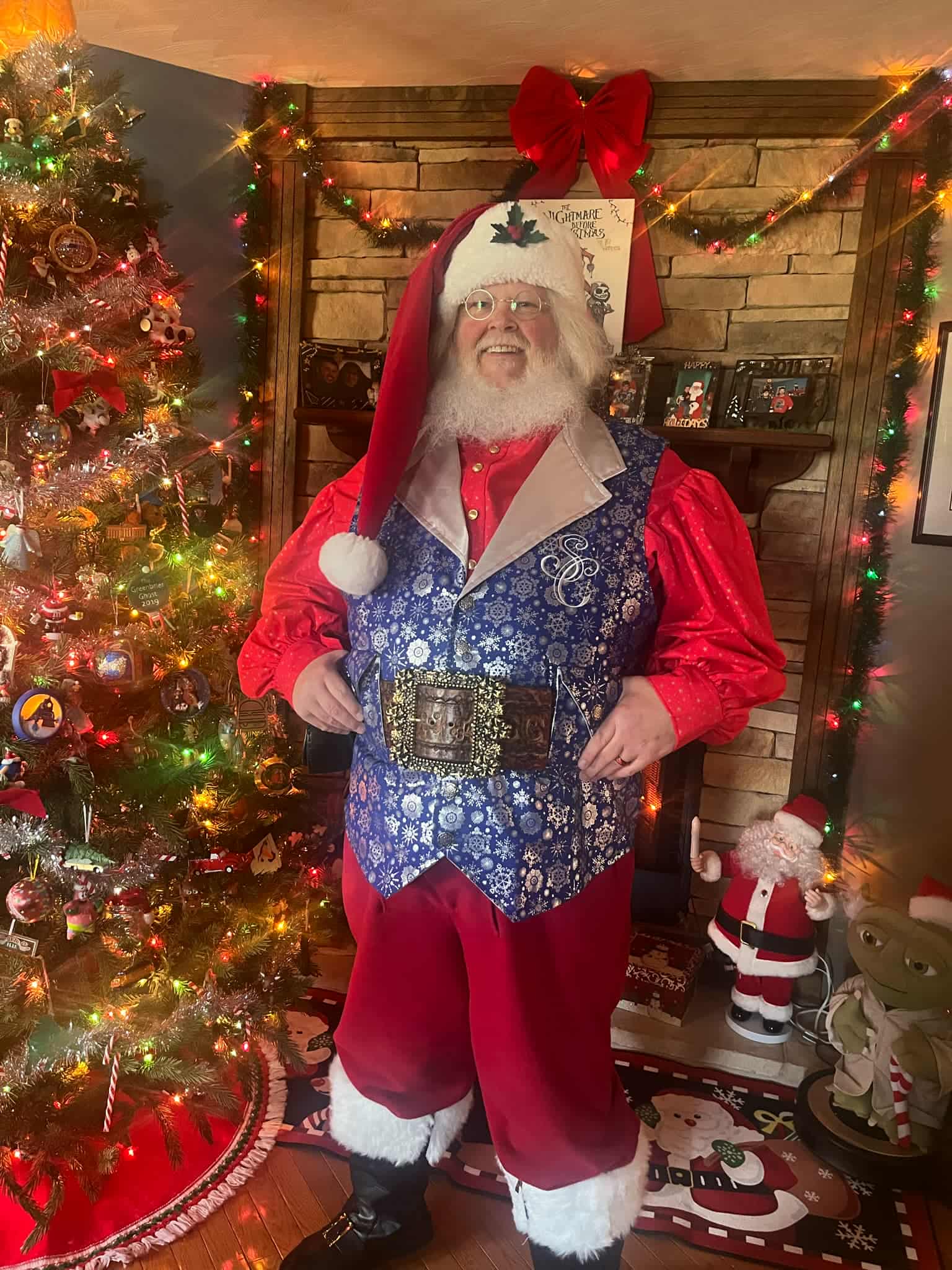 Santa Rod Anderson in an Angie's Originals Puffy Sleeve Shirt, Double Breasted Vest, and Hat.