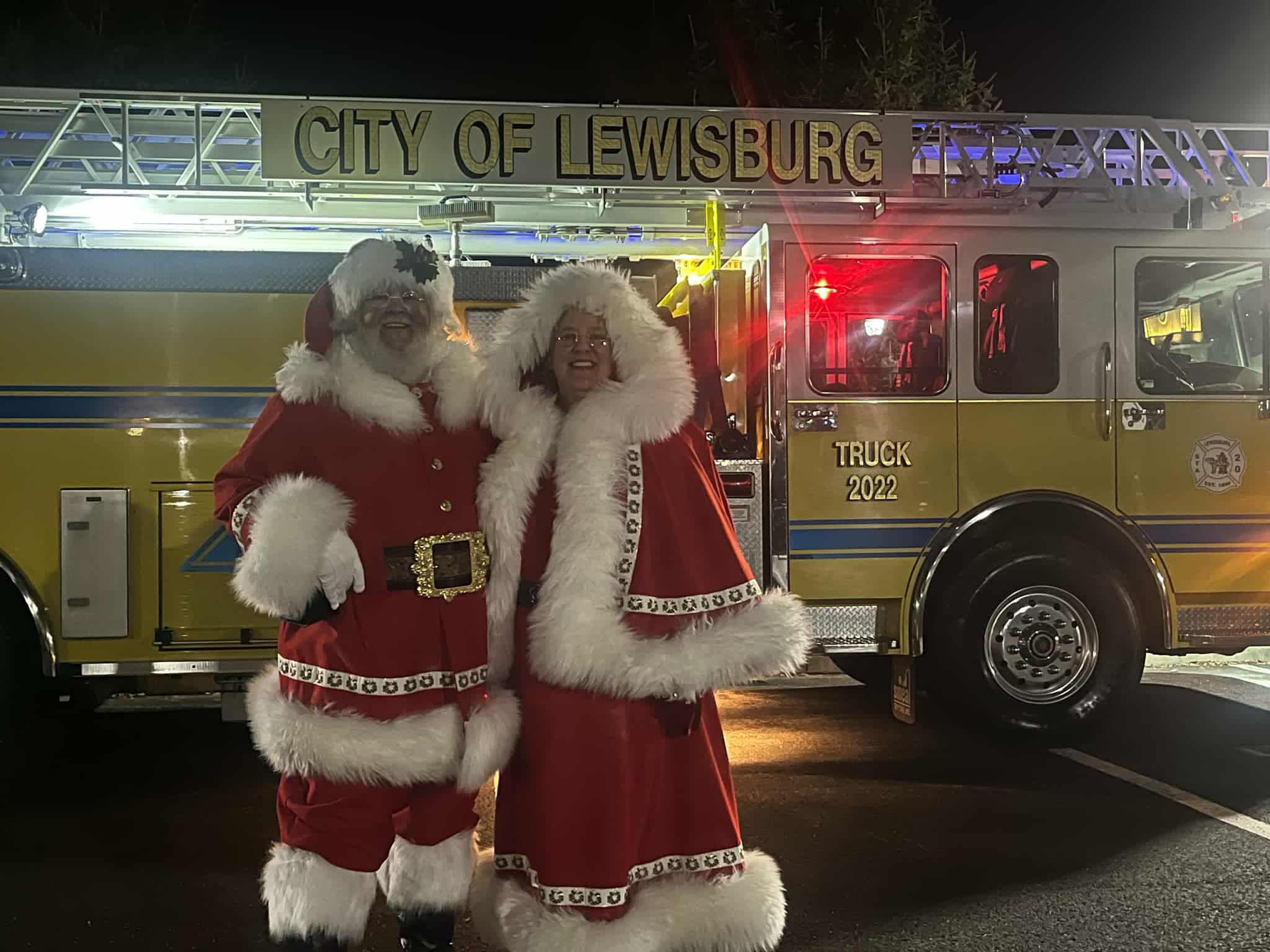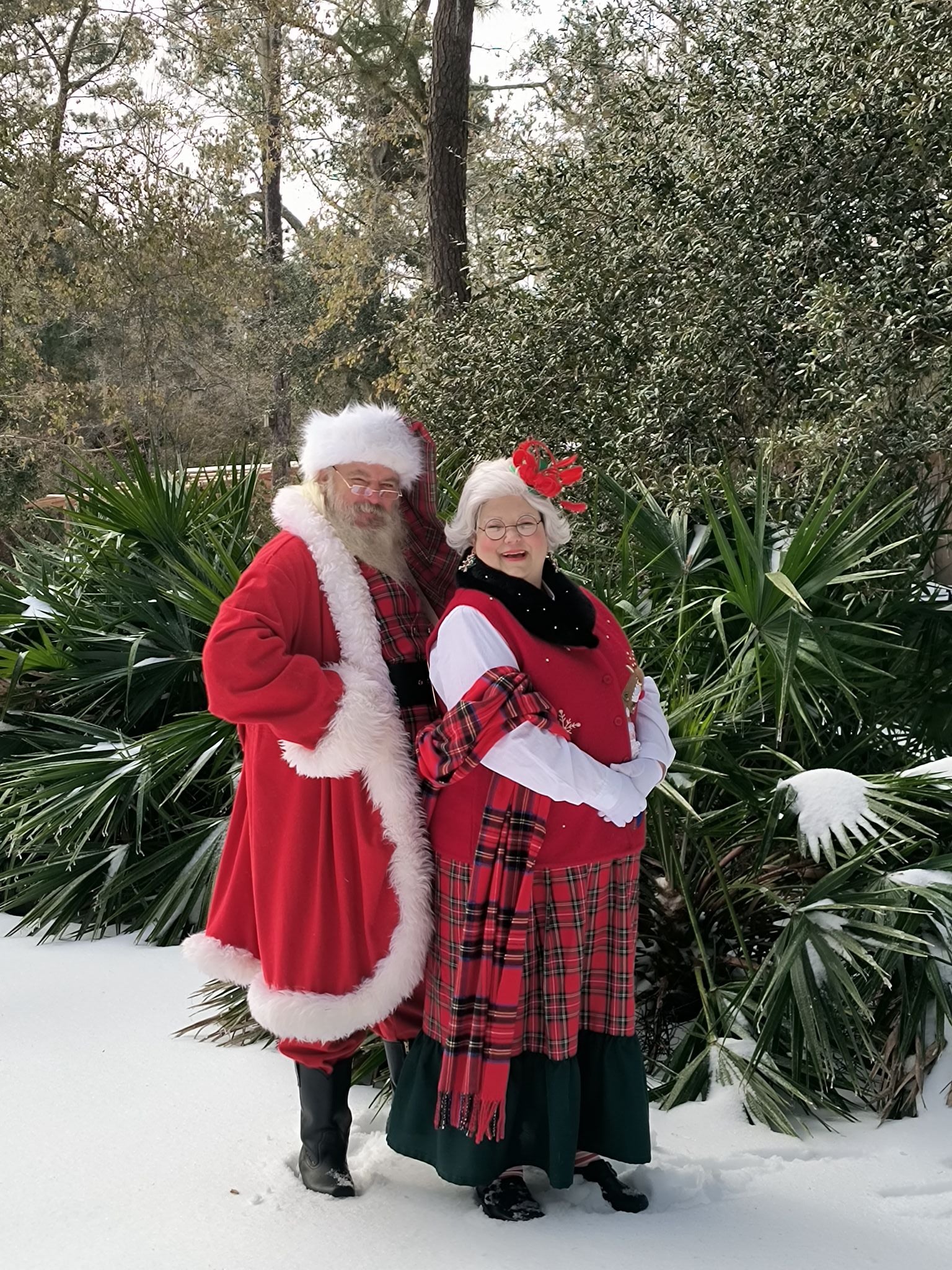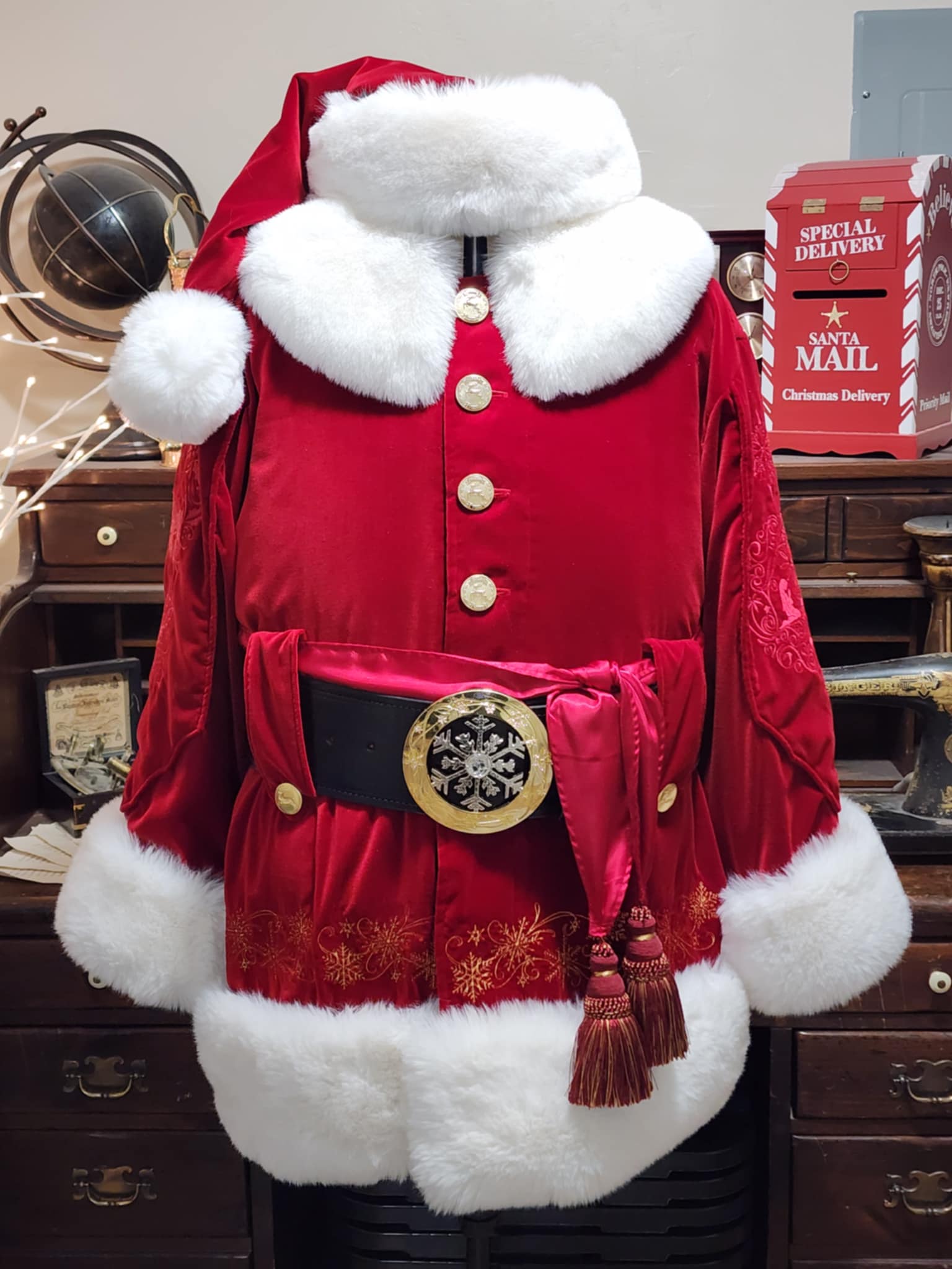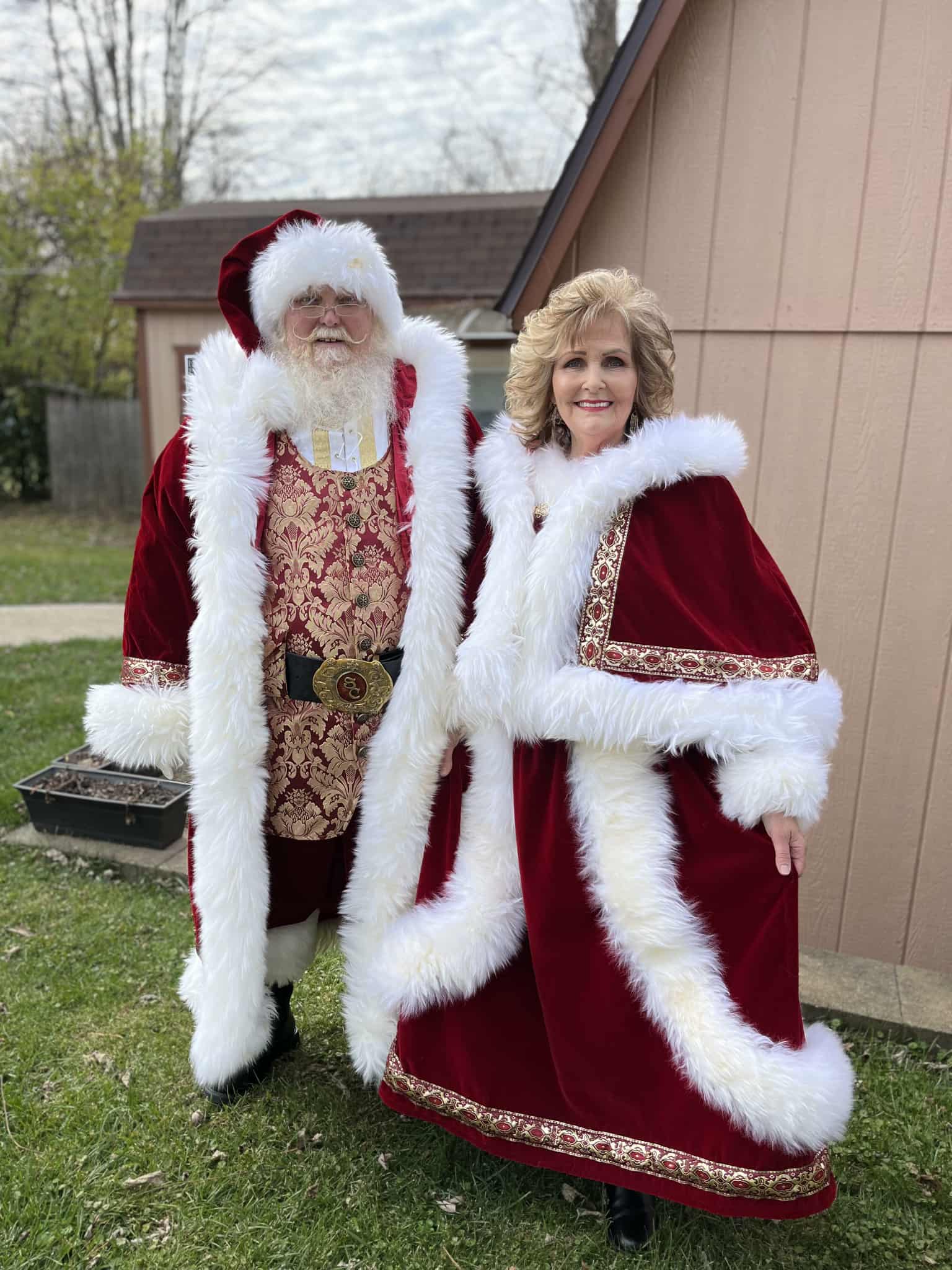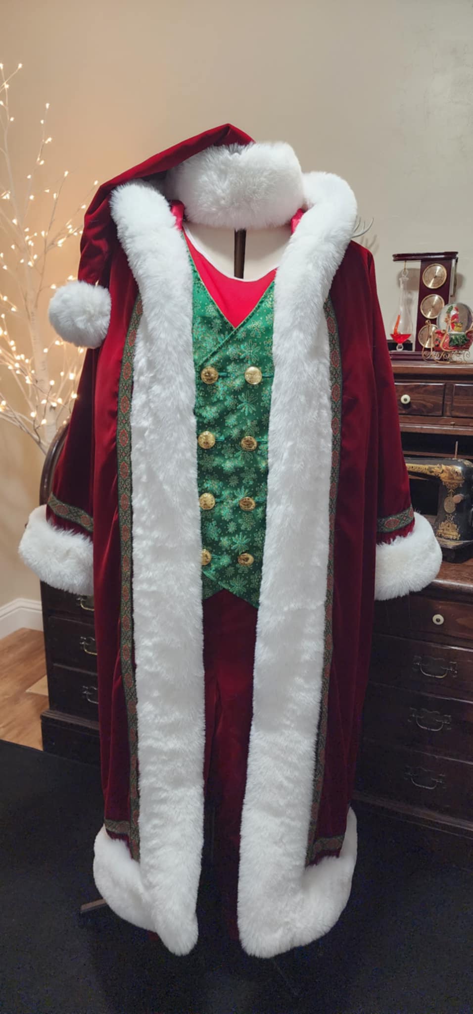 Santa & Mrs. Claus Mosier in Angie's Originals Parade Coat, Double Breasted Vest, Hat, Pants, and a Mrs. Claus Skirt.