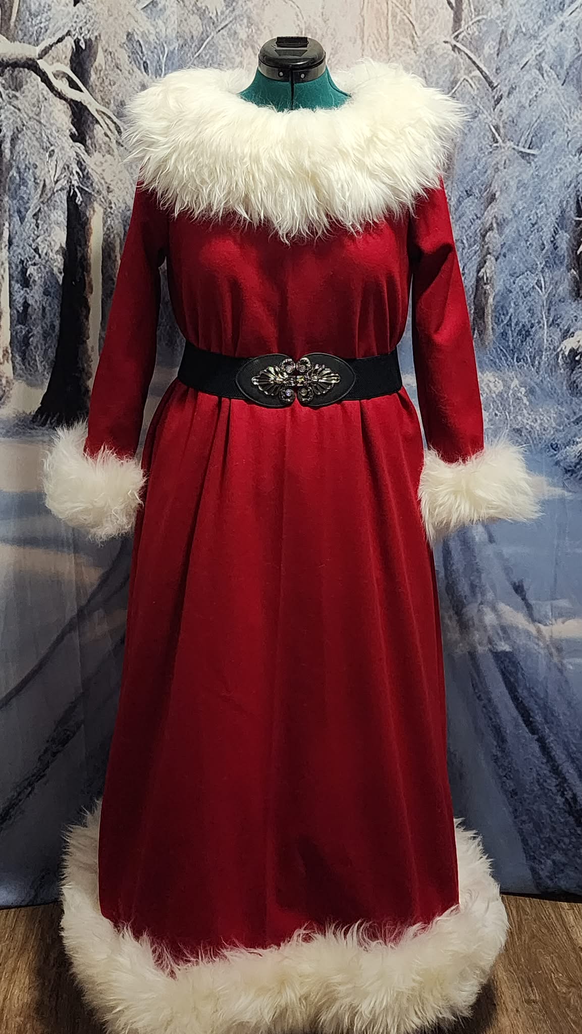 Our Mrs Claus Dress can be made with all of the same fabrics, furs, and trims as any santa suit. The dress starts at $800 includes removable fur, a fur collar, pockets, is fully lined, and a stretchy belt. Trim is available to add as well as a mop or santa style hat. This A-Line style is the style available for this order, we cannot make changes to the style beyond sizing, adding trim, fabric type, fur, and trim at this price.
