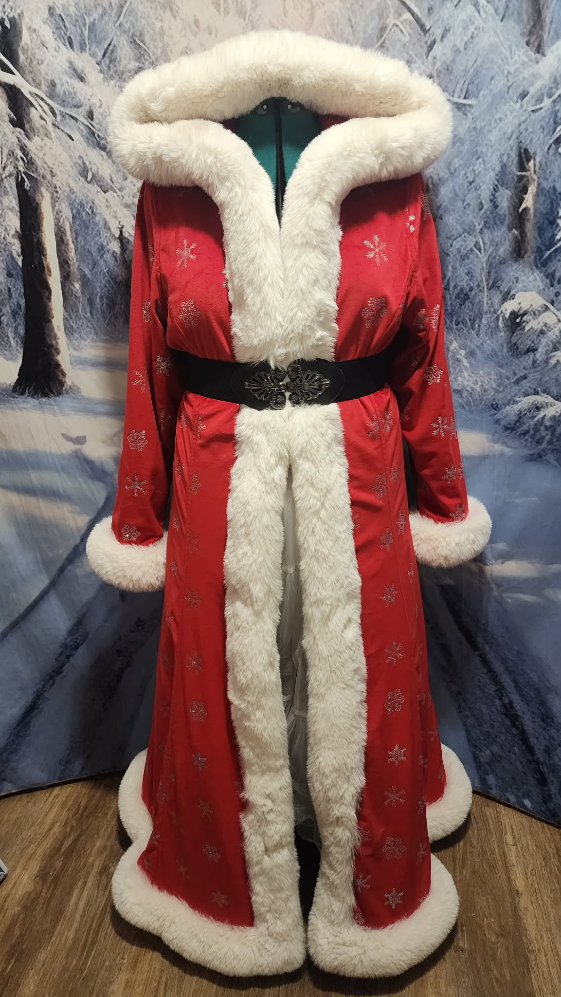 Our Mrs Claus Robe can be made with all of the same fabrics, furs, and trims as any Santa suit. The Robe starts at $1200 and includes removable fur, a fur collar, can be hooded or hoodless, and is fully lined. Trim is available to add as well as a mop or Santa style hat, a stretchy belt, a skirt, and blouse. This flowy robe style is the style available for this order, we cannot make changes to the style beyond sizing, adding trim, fabric type, fur, and trim at this price.