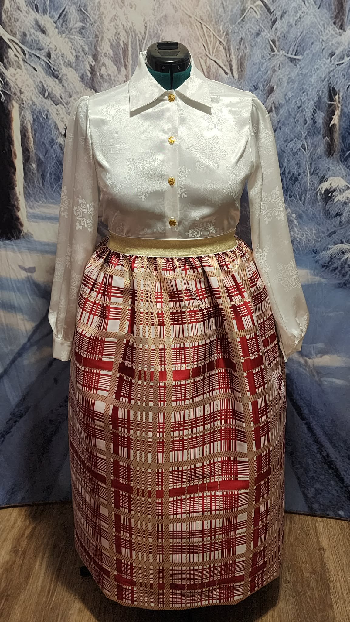 Our Mrs Claus Skirts can be made to match any Santa shirt. There are several collar types available. Blouses start at $150