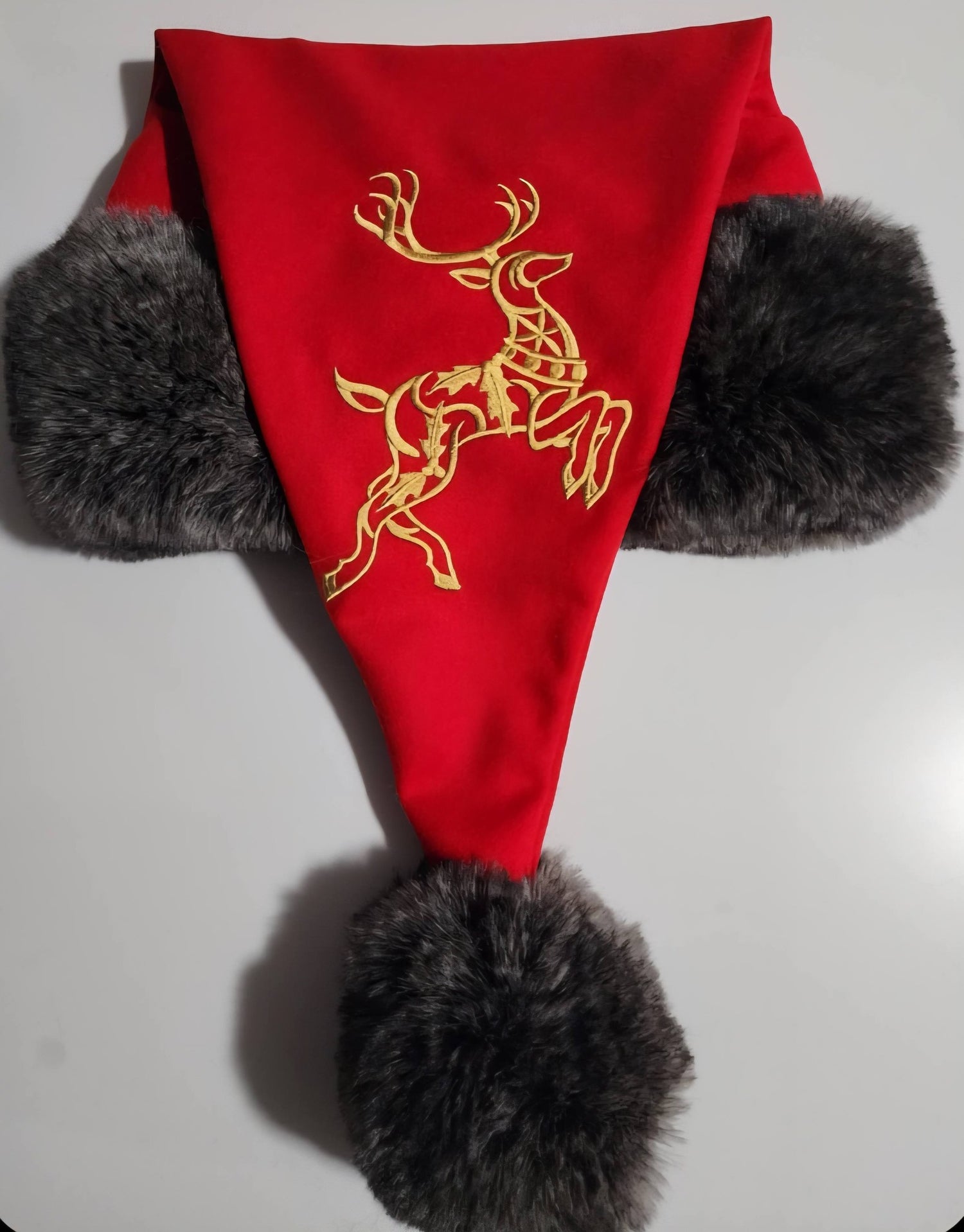 Our Classic Santa Style hat can be made with any fabric from any other item. Embroidery is available as an option as well. Hats start at $80