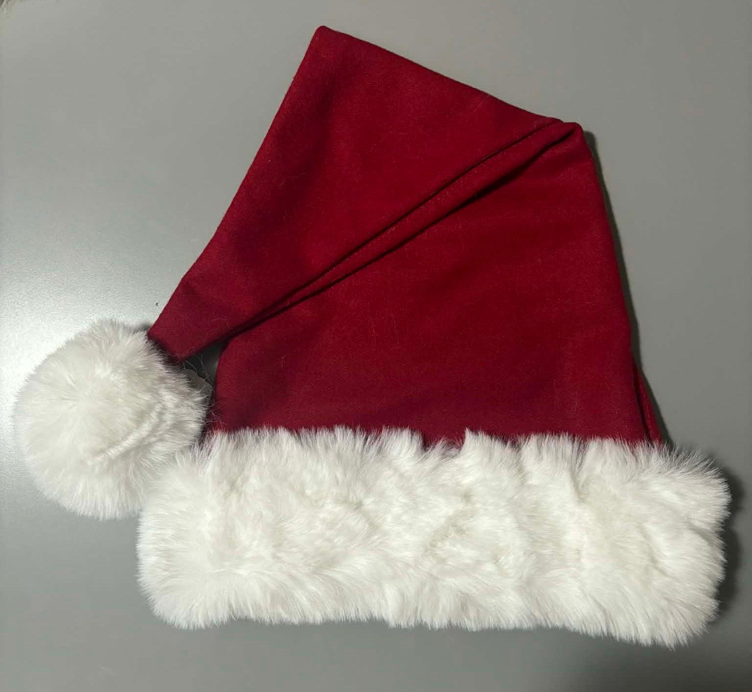 22" Burgundy Broadcloth, White faux fur, 26" long.