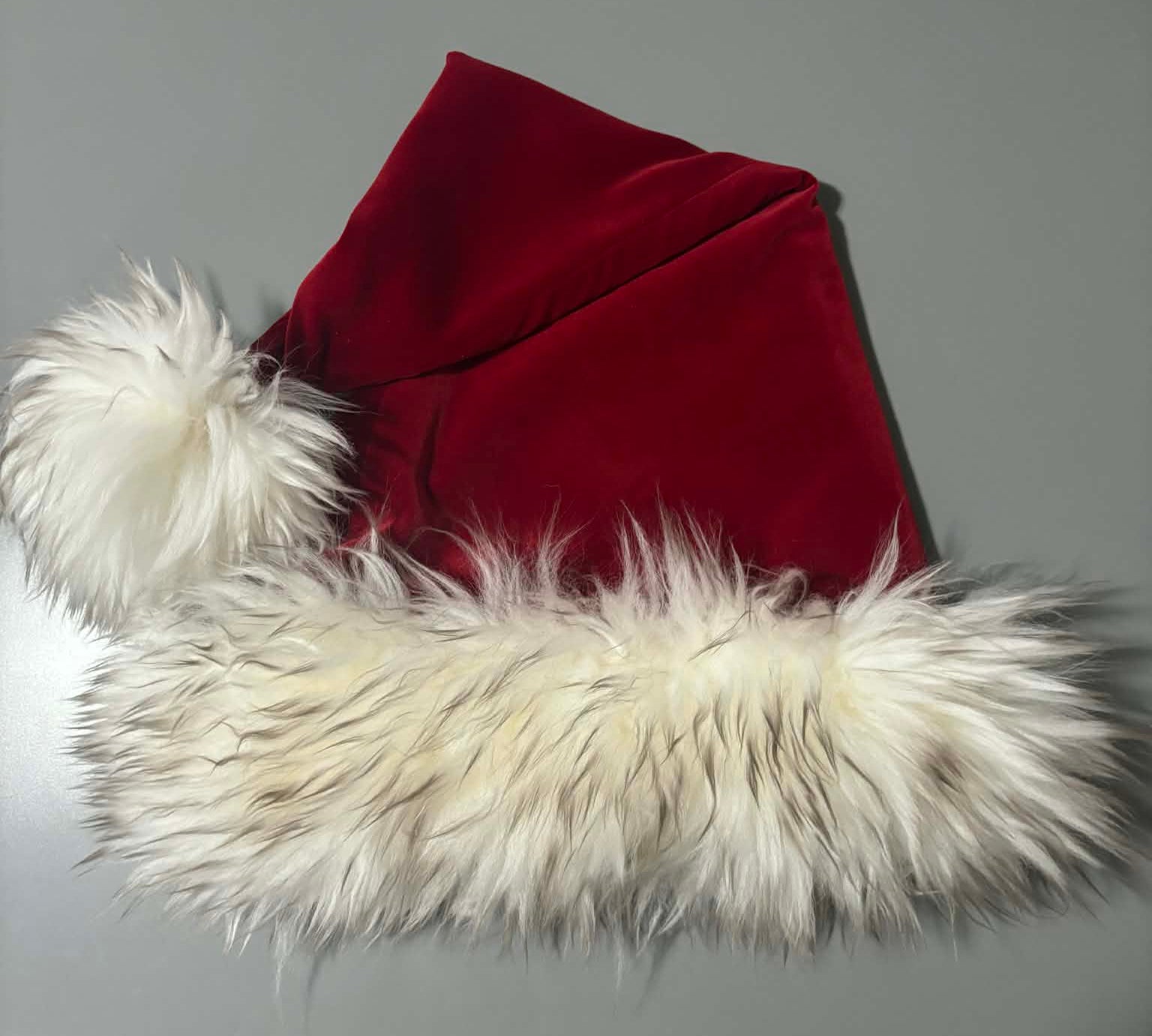 Dark Red Velvet 24", Brown Tipped Shearling Wool, satin lined 26" long.
